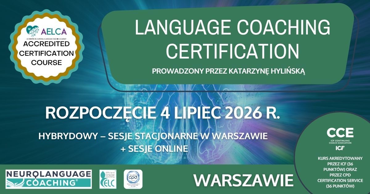 Zostań coachem językowym i sprawiaj, aby twoi uczniowie uczyli się jeszcze skuteczniej! Wznieś swoje nauczycielskie kompetencje na wyższy poziom! Zmień swoją ścieżkę zawodową! Z przyjemnością ogłaszamy daty kolejnej edycji programu certyfikacyjnego Language Coaching Certification, który zostanie zrealizowany w języku polskim. Kurs posiada akredytację ICF - International Coach Federation (30 godzin CCE – Continuing Coaching Education plus 6 godzin Resource Development) oraz brytyjską akredytację CPD Certification Service. Optymalnie równoważy teorię i praktykę – tworzy przestrzeń na aktywny coaching, dzięki czemu uczestnicy natychmiast doświadczają uczenia się poprzez działanie i od razu zaczynają praktykować coaching. MODUŁ I – Wprowadzenie do coachingu Pierwszy moduł kursu jest [...]