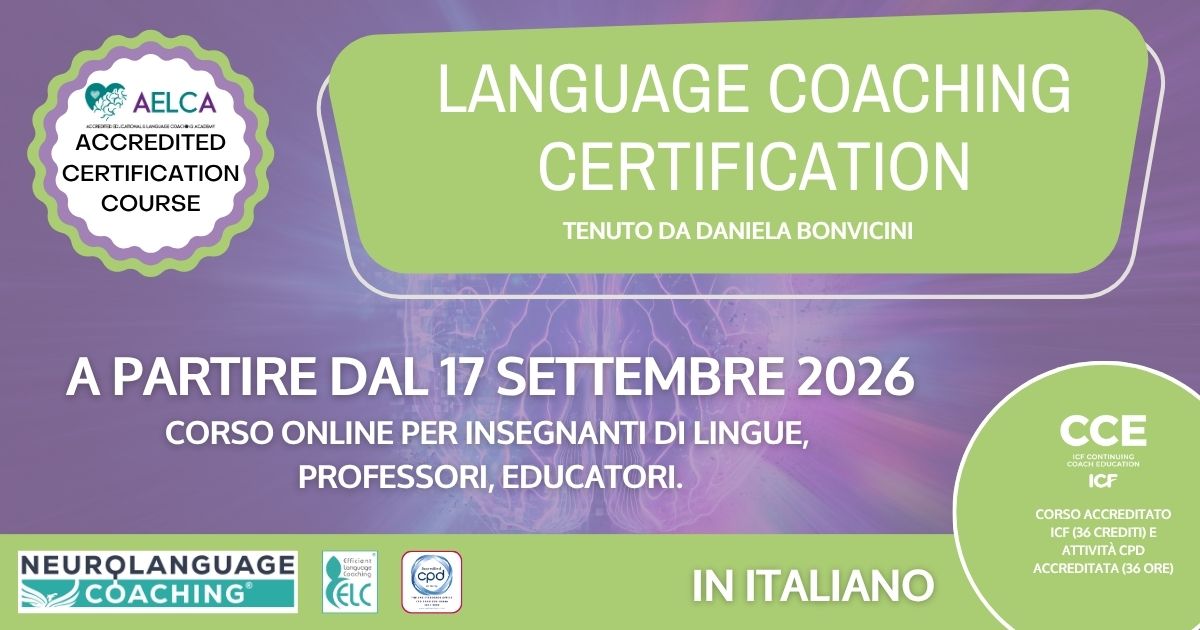 Corso di certificazione in ADVANCED Neurolanguage Coaching® Il programma si concentra sul rafforzamento della pratica del coaching in generale, sull'applicazione di principi, strumenti e processi del coaching nell'apprendimento delle lingue, e approfondisce inoltre le conoscenze sul Neurolanguage Coaching®. Si tratta di un corso avanzato che mira a consolidare e sviluppare ulteriormente le competenze di un Neurolanguage Coach®, conferendo professionalità all'intero processo. Il corso fornisce 18 ore accreditate come CCE (Continuing Coaching Education) da ICF (International Coaching Federation), più 6 ore accreditate come sviluppo risorse (RD). Il programma si svolge esclusivamente online in modalità sincrona, con 8 sessioni di 3 ore. [...]