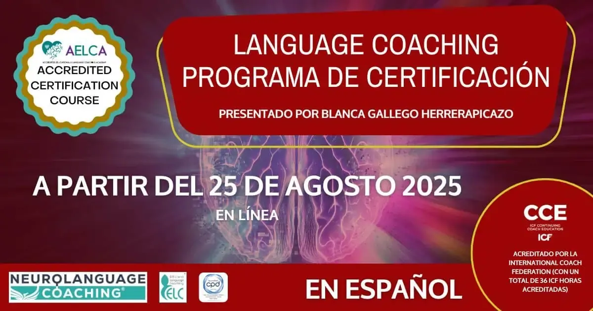 Neurolanguage Coaching Online course for Language Teachers in Spain (delivered in Spanish) Aug 25 18:00 - 21:00 Neurolanguage Coaching Online course for Language Teachers in Spain (delivered in Spanish)