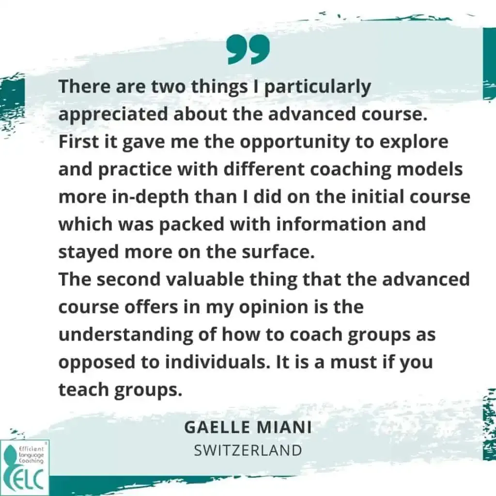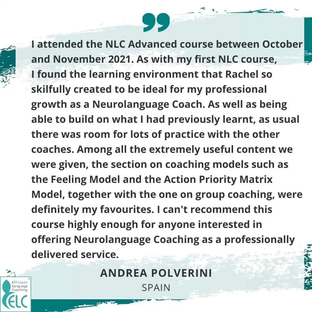 Download DETAILED SCHEDULE >> Requirements: Obligatory participation in the ELC Language Coaching Certification Course. Delivered by: Rachel Paling, Director of ELC & Creator of the Neurolanguage Coaching® concept ADVANCED online starting 11th December 2025 (sessions 19.30-22.30 CET Spain time)Please contact us at i[email protected] for registration procedures |