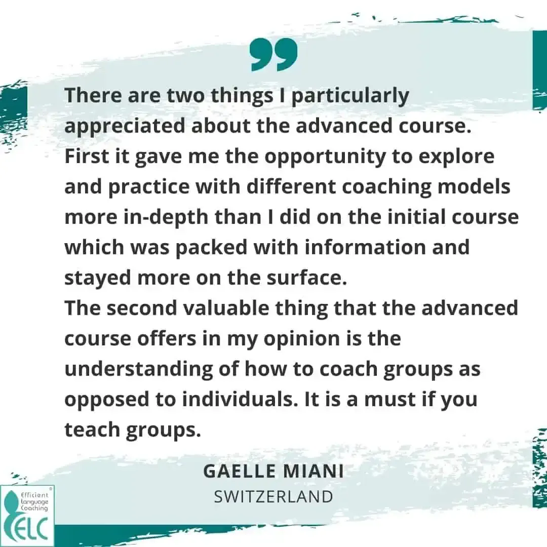 ADVANCED Neurolanguage Coaching® certification:ÂThis programme focuses on not only reinforcing general coaching, but also the application of coaching principles, tools and processes into language learning and also deepens knowledge on neurolanguage coaching®. This advanced course aims to consolidate and develop even further the skills of a neurolanguage coach®, giving professionalism to the whole process. This course provides 18 hours of ICF (International Coach Federation) accredited Continuing Coaching Education (CCE) units, plus 6 hours of resource development. This is an online programme only consisting of 8 sessions of 3 hours. We use a virtual classroom software (Zoom) that is live with Rachel Paling or any of our qualified ELC NL® Trainers and allows all course participants to see each other through the video option, speak to each other and share all kinds of media (presentations, whiteboard, video, internet access, etc.) and therefore it is just as interactive as the face-to-face courses. Learning outcomes: