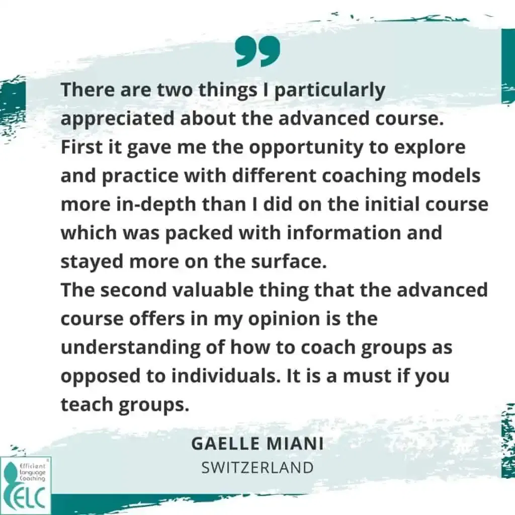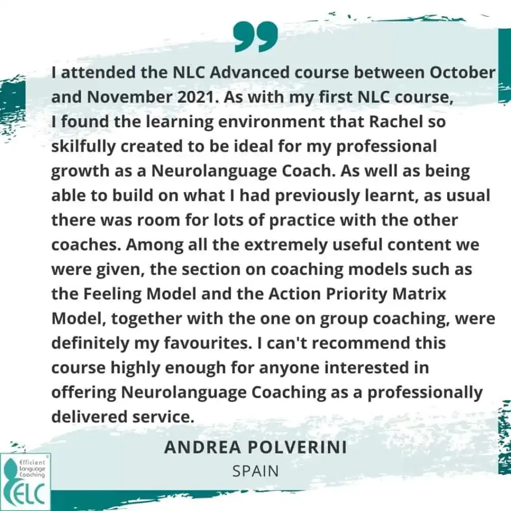 Corso di certificazione in ADVANCED Neurolanguage Coaching®ÂIl programma si concentra sul rafforzamento della pratica del coaching in generale, sull’applicazione di principi, strumenti e processi del coaching nell’apprendimento delle lingue, e approfondisce inoltre le conoscenze sul Neurolanguage Coaching®. Si tratta di un corso avanzato che mira a consolidare e sviluppare ulteriormente le competenze di un Neurolanguage Coach®, conferendo professionalità all’intero processo. Il corso fornisce 18 ore accreditate come CCE (Continuing Coaching Education) da ICF (International Coaching Federation), più 6 ore accreditate come sviluppo risorse (RD). Il programma si svolge esclusivamente online in modalità sincrona, con 8 sessioni di 3 ore. Utilizziamo un software di aula virtuale (Zoom) per sessioni dal vivo con la nostra Trainer qualificata ELC NL® Daniela Bonvicini. Questa modalità permette a tutti i partecipanti al corso di vedersi attraverso l’opzione video, di parlarsi e di condividere tutti i tipi di media (presentazioni, lavagna, video, accesso a internet, ecc.), ed è quindi altrettanto interattivo dei corsi in presenza. Risultati dell’apprendimento: